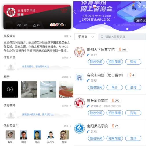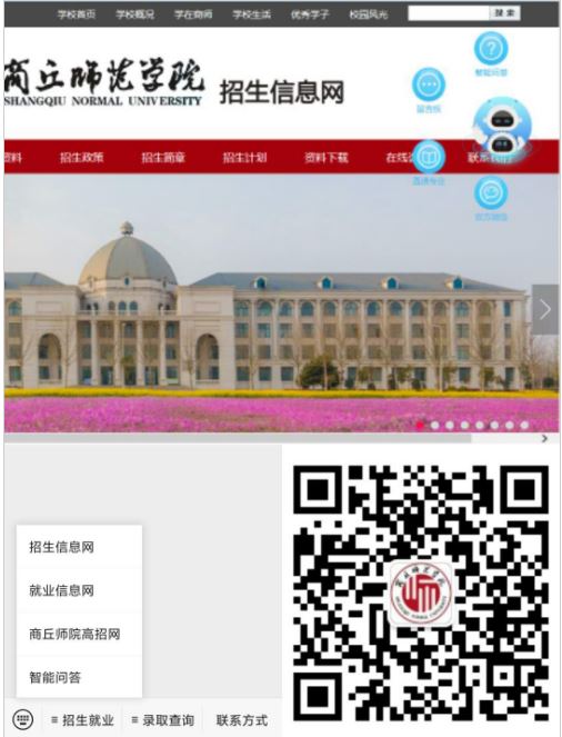 在新冠疫情期间,为做好我校2020年招生咨询工作,最大限度的为广大考生及家长提供最为便捷的咨询方式,使他们及时、准确的了解商丘师范学院的校风、校貌,更好咨询和报考我校,招生与就业处开通了各种线上咨询服务,自2月初我校通过体教联盟app(侧重于我校“武术与民族传统体育”专业学生)、招生信息网“智能问答系统小E”、微信公众号、微博、QQ群等方式全方位为考生提供服务,争取实现线上咨询全覆盖。