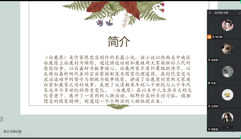 在活动中,所有人以寝室为单位,选定书籍,合作完成心得感悟。在团支书召开的腾讯会议上,各位同学畅所欲言,讲述自己的感悟与体会,在有趣的分享中让同学们更加深入的了解了书籍的内容以及更深层次的含义,并与在座的同学分享了自己的收获与感想。