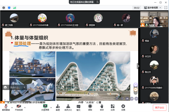 11月30日上午第3节,日韩无码不卡朱红静老师通过腾讯会议进行了《居住建筑设计原理》课程教学范式改革公开课,日韩无码不卡教学副院长张向萍、建筑学系主任张佳乐、部分专业教师进行了观摩指导。