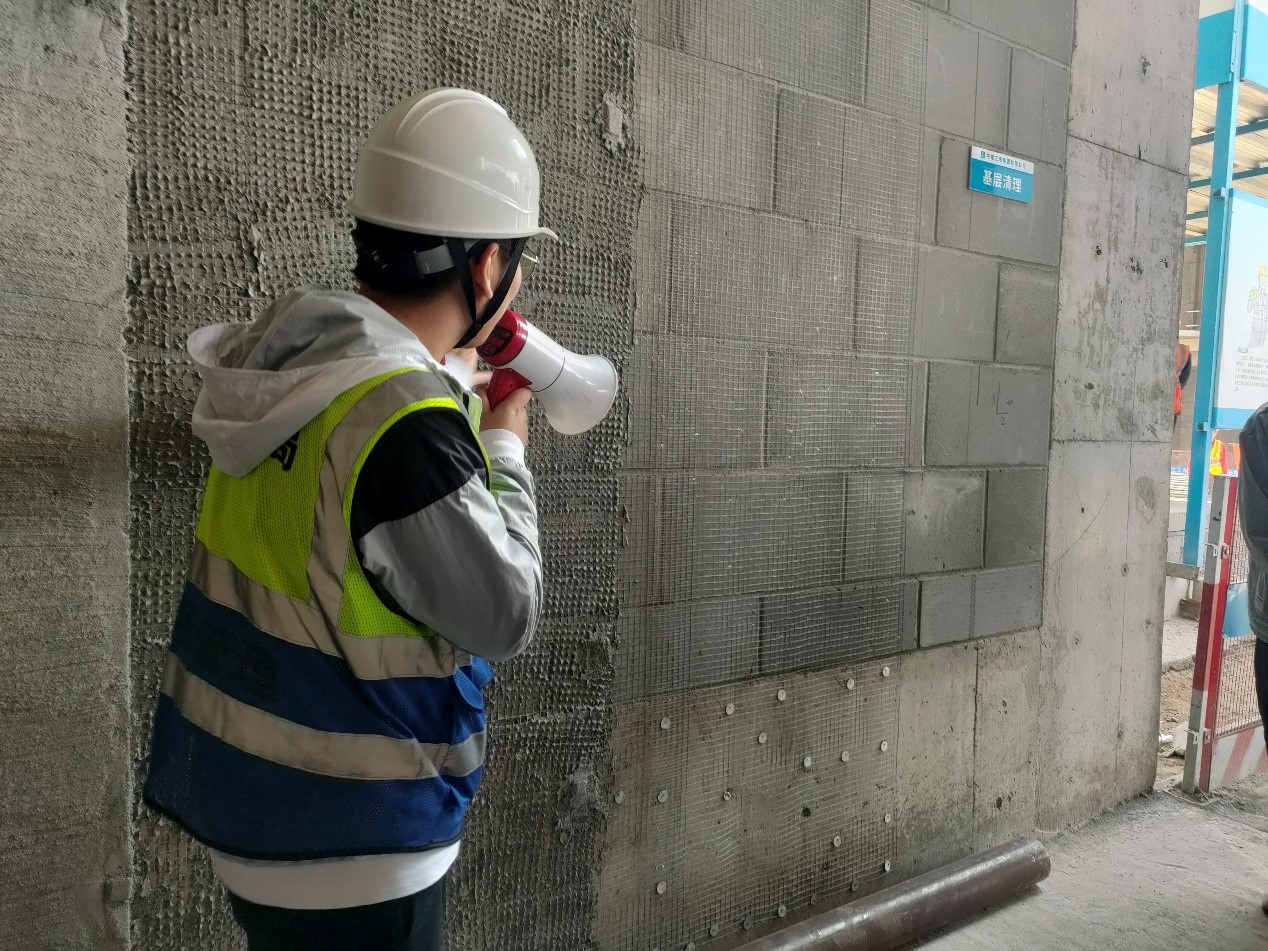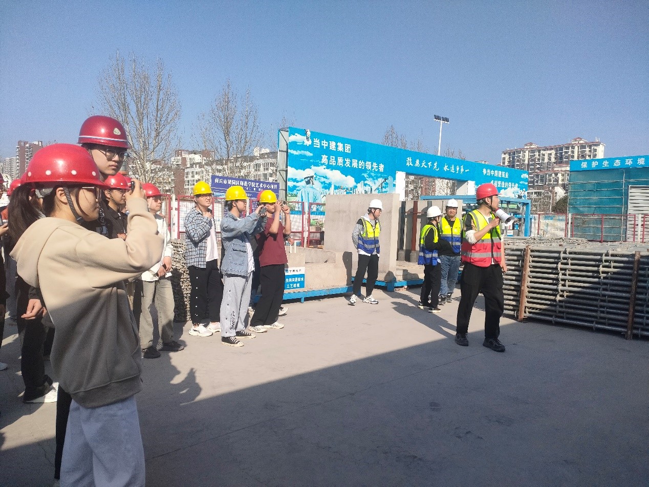 进入施工现场前,郑慧慧为大家分发安全帽,并强调施工现场各项安全注意事项。施工管理人员向大家介绍艺术中心项目外观设计理念及房屋建造流程。随后,项目安全员为同学们介绍消防安全体验区、样品展示区、劳动保护体验区、安全体验区、综合用电体验区五个施工基本场区,建筑主体结构工艺样板及顶层房屋构造。