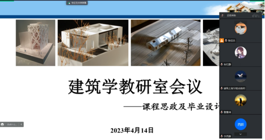 为挖掘课程思政研究深度,更好推进毕业设计工作开展,4月14日,建筑学教研室召开期中课程思政及毕业设计深度研讨会,对毕业设计成果提交要求及近期工作安排进行部署。会议由教研室主任张佳乐主持。