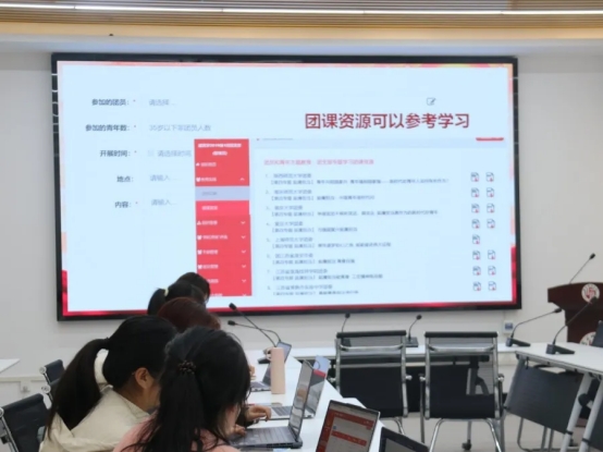 杨奕佳带领大家回顾了2023年我院团委和各团支部的工作开展情况,同时对2024年我院团支部的工作重点进行了统一部署。随后,她对智慧团建系统进行了业务指导和培训,主要是对教育实践、组织管理、团员管理以及团内激励四大板块进行讲解。