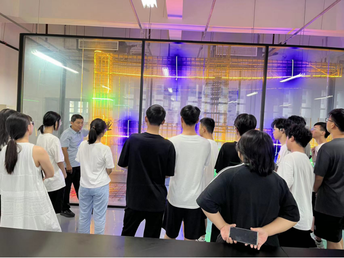 戚瑷娜带领同学们参观楼宇智能化工程实训系统。实训装置模拟了实际的建筑场景,为学生提供了接近工程现场的实训环境。同时向同学们介绍了楼宇智能化设备监控系统,让他们了解先进的传感器技术、自动化控制技术和通信技术是如何实现对楼宇设备的实时监测、控制和优化管理的。